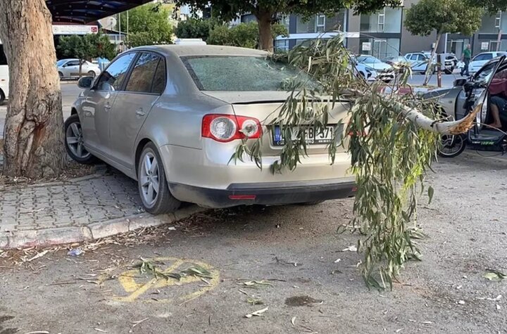 Faziletli ilçesinde rüzgar nedeniyle kırılan ağaç kısmı, park halindeki bir arabanın art camını patlattı.