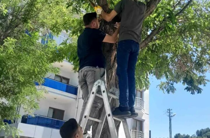 Konya'nın Karapınar ilçesinde, meskende beslenen bir kedi ağaca tırmandı. Esnaf Mehmet Emin Kolay ve...
