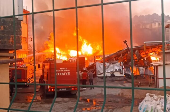 Konya'nın Beyşehir ilçesindeki bir silah fabrikasının kundak atölyesi ve depo kısmında çıkan yangın, itfaiye...